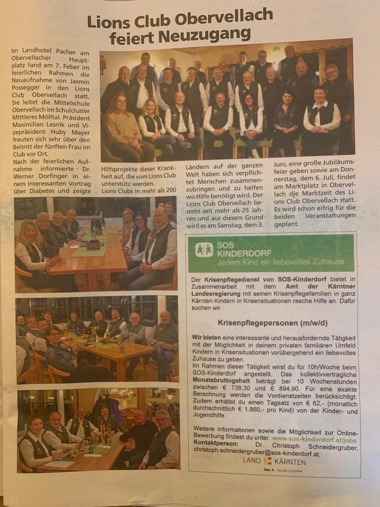 Im Landhotel Pacher am Obervellacher Hauptplatz fand am Dienstag den 07.02.2023 im feierlichen Rahmen die Neuaufnahme von Jasmin Possegger in den Lions Club Obervellach statt. Sie leitet die Mittelschule Obervellach im Schulcluster Mittleres Mölltal. Präsident Maximilian Lesnik und Vizepräsident Huby Mayer freuten sich sehr über den Beitritt der fünften Frau im Club vor Ort. Nach der feierlichen Aufnahme informierte Dr. Werner Dorfinger in einem interessanten Vortrag über Diabetes und zeigte Hilfsprojekte dieser Krankheit auf, die vom Lions Club unterstütz werden.